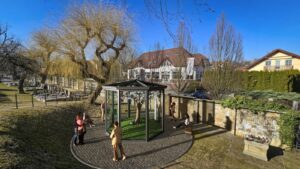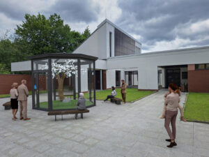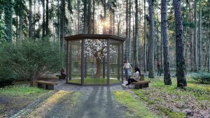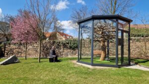 Skleněný altán je vybaven bezpečnostním sklem a integrovaným tabletem pro ovládání a informace o Eiwě.