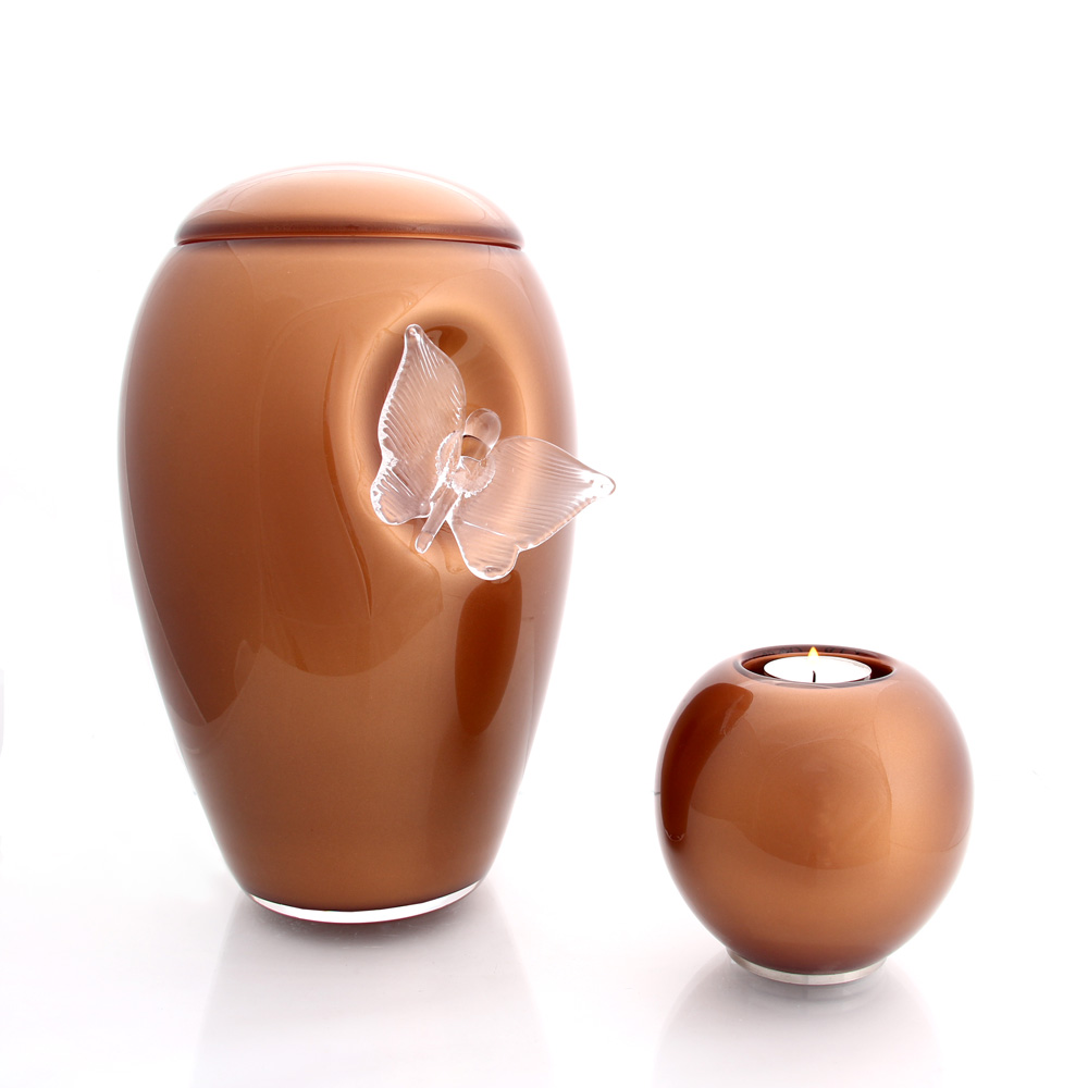 Ručně foukaná urna z kvalitního křišťálu. Design je tvořen hutní technikou při výrobě samotné urny. Vnitřní nástřik urny v metalické barvě kombinovaný s křišťálovým motýlem vytváří velmi emotivní pocit. Na urnu je možné pískovat libovolný text za příplatek. V nabídce máme rovněž miniurnu sloužící i jako svícen. Tato miniurna je doplněná o uzavírací dno z leštěného nerezu. Veškeré skleněné urny vyrábí naše společnost Memory Crystal s.r.o.